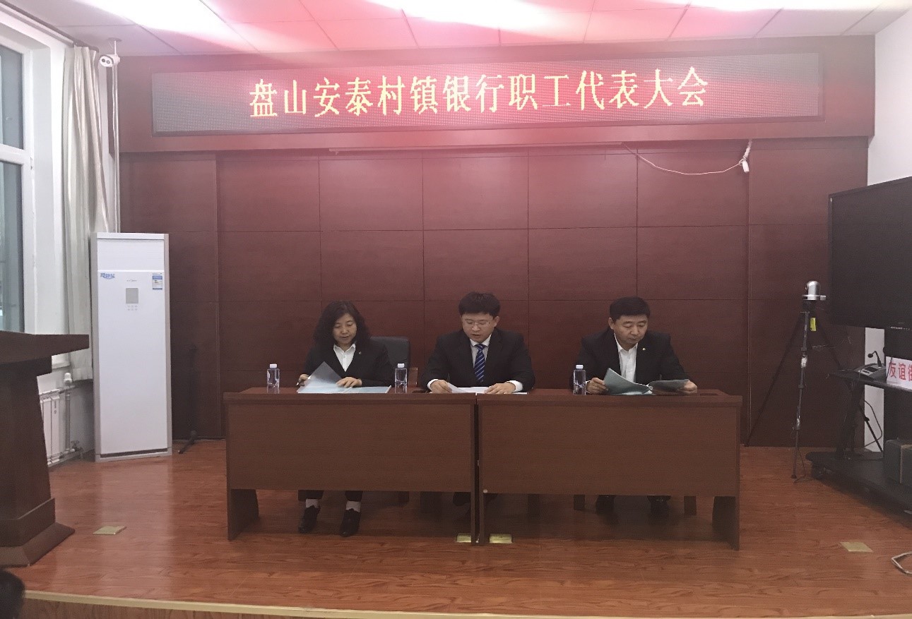 2017年4月7日,盘山安泰村镇银行一届一次职工代表大会在友谊街道会议室隆重举行。会议由张浩行长主持,全体员工参加。