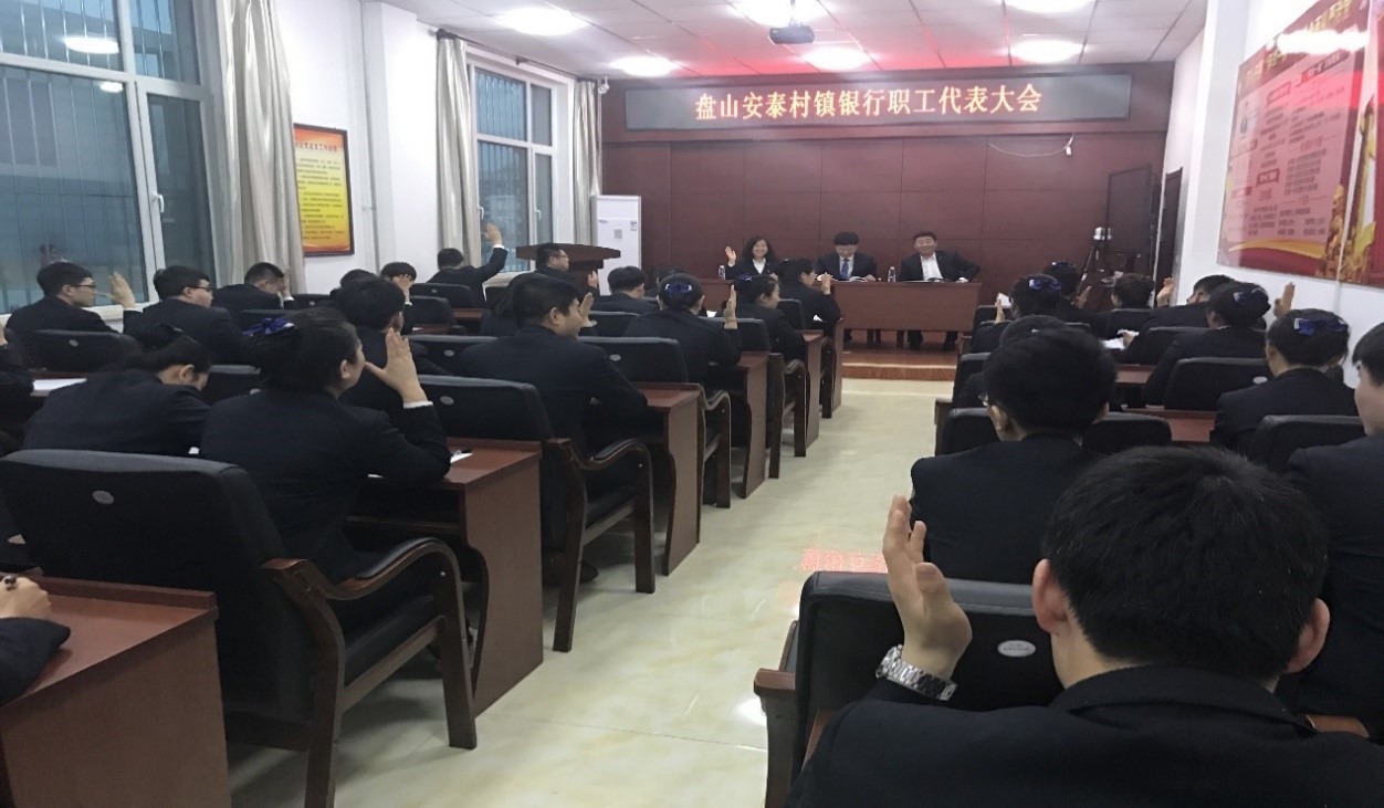 按照会议程序,首先审议并通过了《关于选举盘山安泰村镇银行职工代表大会各委员成员的议案》选举了主席、副主席及各位委员等30位职工代表,建立健全了我行的职工代表大会制度,进一步的保障了我行员工的权利和利益。职工代表大会主席贾秀菊表示:最大化发挥职工代表大会职能,为职工多办实事,切实提升员工的幸福指数,着力建设“员工之家”幸福驿站。